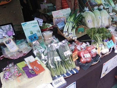 本日は農家さんが丹精込めて作ったネギ、トマト、小松菜、白菜、カブ、人参、お餅、お米、そして仮設住宅の方々が作った復興グッズも販売しました。
