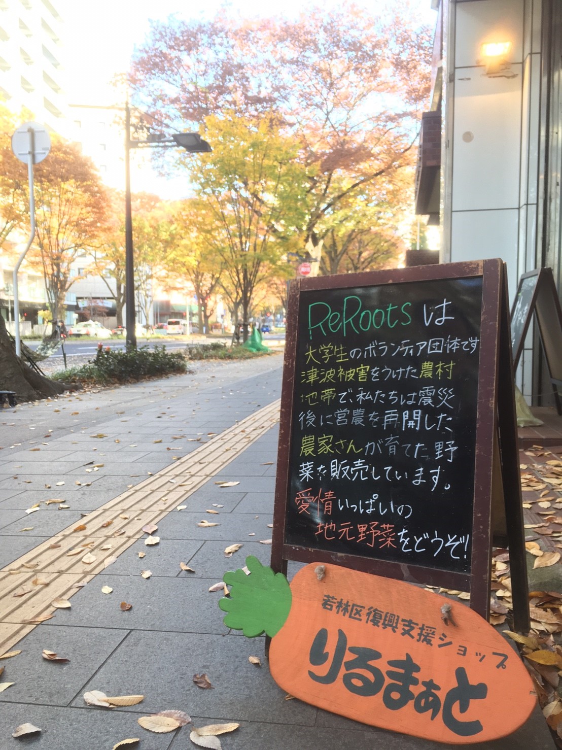 先日の11月13日(日)に、大町西公園近くの青葉通りで行われた「けやきのさきマルシェ」に、ReRootsからも出店させていただきました。